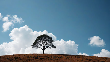 Lonely tree on a hill with a blue sky in the background