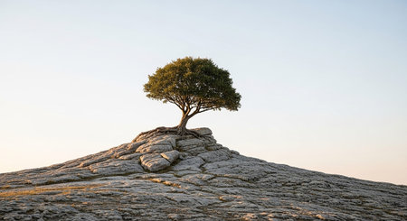 Lonely tree on the top of a rock in the morning