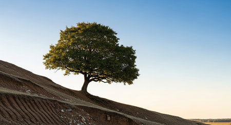 Lone tree on a grassy hill under a clear blue sky, serenity and nature concept
