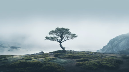 a lone tree stands atop a hill, surrounded by a misty atmosphere, showcasing the beauty of norwegian nature. this captivating image follows a narrative-driven visual storytelling approach, reminiscent of the dusseldorf school of photography. the high-resolution uhd quality brings out the teal and gray tones, enhancing the naturalistic depictions of flora and fauna. ai generated