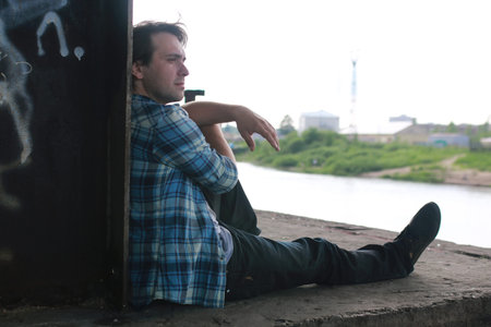Man sitting on sidewalk looking concerned and depressed