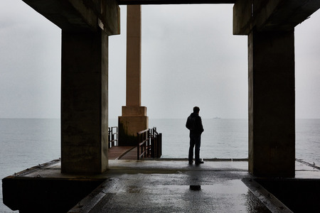 Man stands alone on a pier of sea in bad weather. Foggy air.