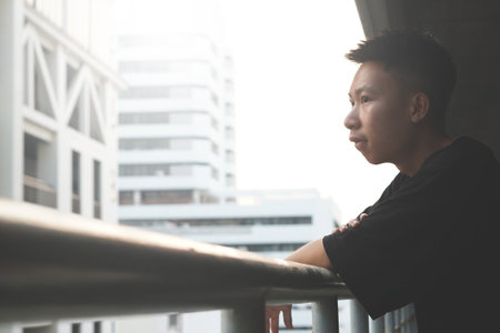 Asian miserable depressed man stay alone with sky background. Depression and mental health concept.