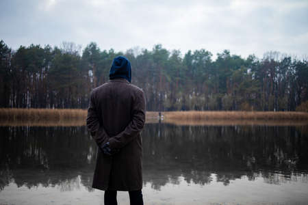 Lonely man looks at the water. Meditation in the open air. Nature togetherness