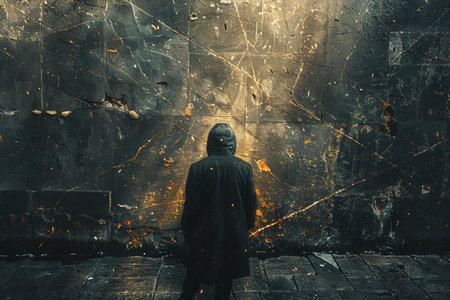A lone man stands facing a wall, his silhouette cast in shadow. The image evokes a sense of loneliness and contemplation.