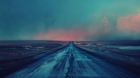 An AI generated illustration of An isolated long road leading through an uninhabited area