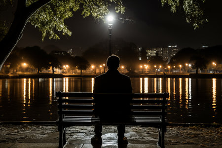 a man sits on a bench in a wooden park under a tree at night, creating an atmospheric seascape. the black and gray tones add to the emotional and dramatic scenes, enhanced by vignetting. the ethereal landscape showcases silhouette figures, resulting in a captivating and artistic photograph. ai generated