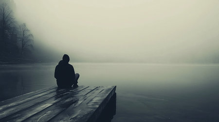 A person sits alone on a wooden dock, silhouetted against a misty lake, lost in thought.