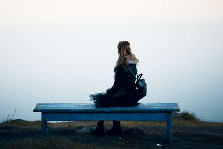 a man in a black jacket sits with his back and looks at the sea on the sunny day. High quality photo