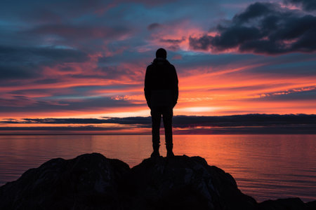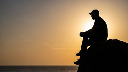 Silhouette of a man sitting on a cliff, soaking in the vibrant colors of a sunset while gazing at the tranquil ocean horizon