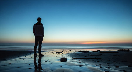 Silhouette of a Contemplative Man Gazing at the Tranquil Open Seascape at Dusk Along the Pier