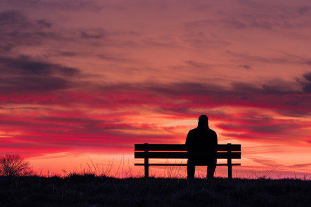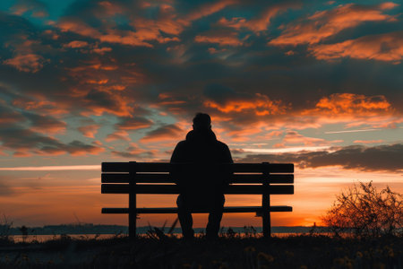 A man sits on a bench in a field with a beautiful sunset in the background. Concept of solitude and contemplation, as the man is alone in the peaceful setting