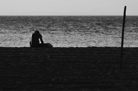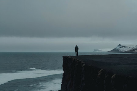 Eternal Solitude: A Lonely Figure Braving the Vast Seashore -ar 3:2