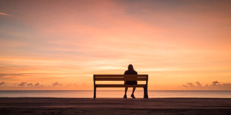 A solitary figure sits on a yellow bench, gazing at the colorful sunset reflecting on the calm ocean waters. The tranquil atmosphere offers a moment of contemplation and serenity.