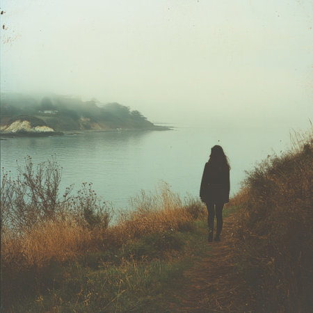 Person in a hooded jacket stands facing the ocean, waves lapping at the shore, in a monochrome, misty scene.