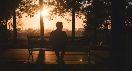 Silhouette of a man sitting alone on a park bench, looking out at a sunset and city skyline. The image captures a mood of contemplation, solitude, and peacefulness in an urban nature setting.