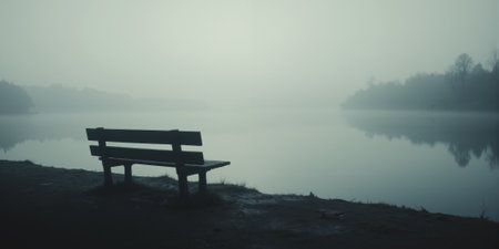 Foggy lakeshore with a wooden bench for peaceful and reflective content. A solitary, weathered wooden bench sits on the edge