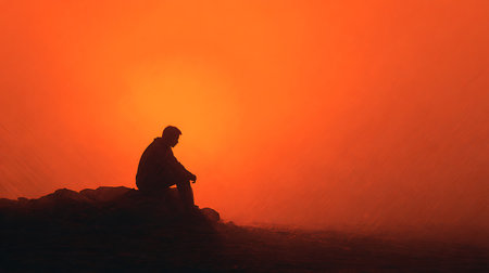 A solitary figure sits quietly at the edge of a misty bridge, enveloped by fog, evoking deep feelings of loneliness and contemplation.