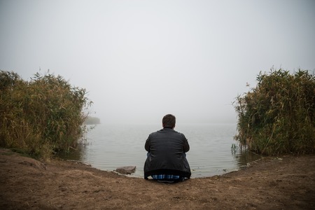 A man sits alone on a wooden bench facing a calm lake shrouded in thick fog. The mood is contemplative, melancholic, and serene, with the figure isolated against the misty grey background.