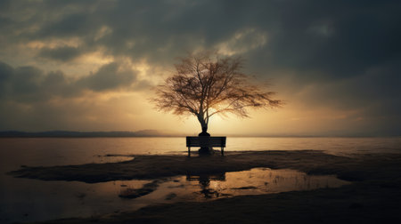 Loneliness and depression concept. Solitude, melancholy. Lonely person sits alone on a bench by the tree. AI Generated