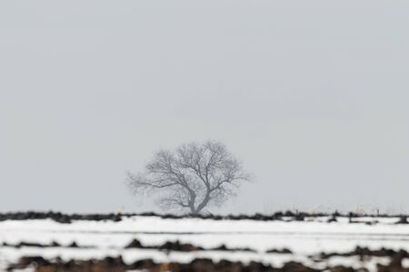 A single, bare tree stands in the center of a vast, snow-covered field. The tree's branches are heavily coated in frost and ice, giving it a white, ethereal appearance. The ground is a blanket of snow with patches of dark earth. The background is a soft, hazy white, suggesting fog or a very overcast sky, creating a minimalist and stark winter landscape.