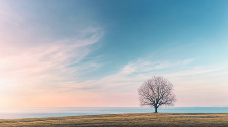 A solitary tree rises in a serene winter scene, surrounded by a muted landscape. The sky is clear, with soft pastel hues hinting at sunset, creating a peaceful atmosphere.