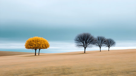 A lone tree with vibrant yellow foliage gently rises from still waters, its reflection merging seamlessly with the subdued sky, evoking serenity and simplicity.