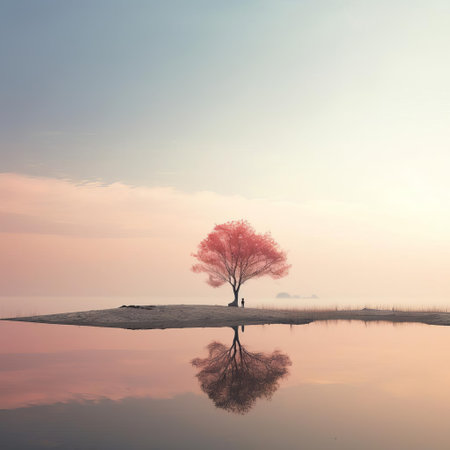 A solitary tree standing in still, reflective water at sunrise, mist hovering above the surface, creating a serene and peaceful atmosphere