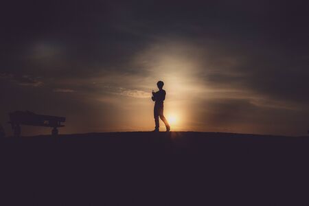 Amazing sunset. Silhouette of the young man on the mountain top. - Backlight with sun reflections