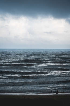 A grayscale shot of a lonely person walking on the beach under dark clouds