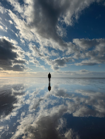 Description: a solitary figure gazes across a shimmering, rain-slicked shoreline under a brooding sky, where turbulent clouds form a dreamlike reflection, merging land and heavens
