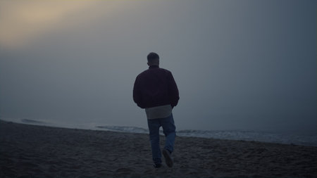 Back view young man walking on sandy beach in morning fog. Lonely guy looking sea horizon. Male model having walk along ocean shore. Peaceful man enjoying sunrise. Depression and sadness concept