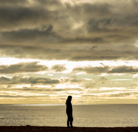 Emotion conceptual image. Lonely woman walking on the beach