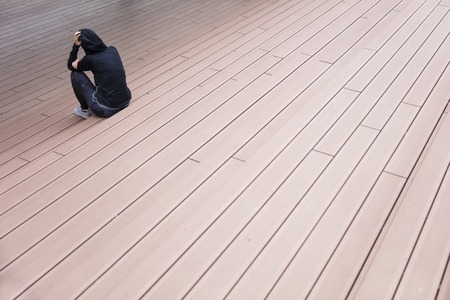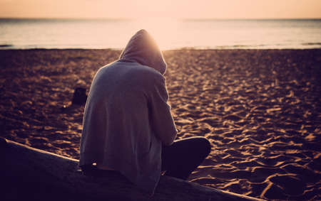 Toned Photo of Sad and Lonely Man in a Hoodie sit on the Log at Seaside