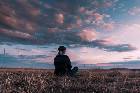 A man sits in a field, gazing at the setting sun with a contemplative expression on his face. The colorful sky reflects in his eyes as he enjoys the tranquil moment in nature.
