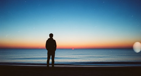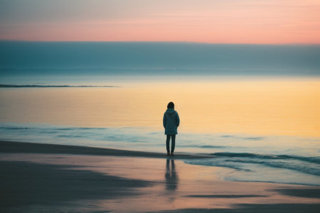 A person stands facing a soft glowing horizon during sunset, observing the colors of the sky and lost in thought.