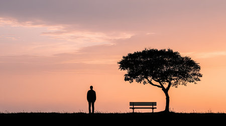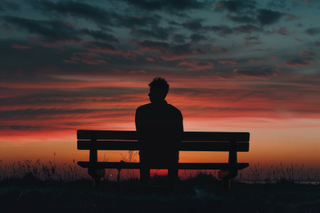 A man sits on a bench in a field at sunset. The sky is filled with clouds, and the sun is setting in the distance. The man is lost in thought, and the scene is peaceful and serene
