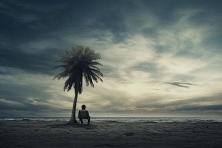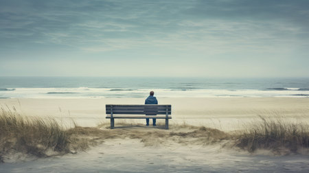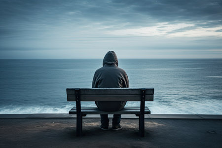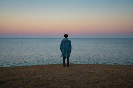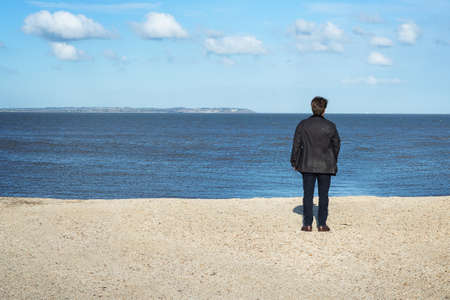 Desolate individual gazing out to sea isolated on a blue gradient background