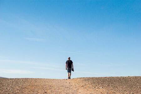 The world where abstract architecture and nature concepts becomes reality and comes to life in a most unexpected ways. Man staring in ocean horizon.