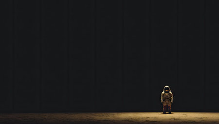 An astronaut figure stands alone on a surface, illuminated by a single light source against a dark backdrop. The composition features a strong contrast of light and shadow. Suitable for conceptual illustrations, this image provides ample copy space, making it appropriate for various commercial applications and design projects.