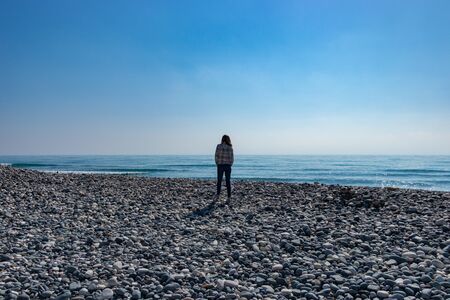 The girl stands on a pile of stones and looks at the sea. Woman resting on the sea coast. Tourist explores the sights of Cyprus Female silhouette against the sunset sky.