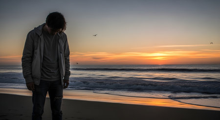 A young man stands alone on a sandy beach, looking down with a somber or contemplative expression as the sun sets over the ocean. The beautiful but melancholic scene evokes feelings of sadness, loneliness, introspection, and heartbreak.