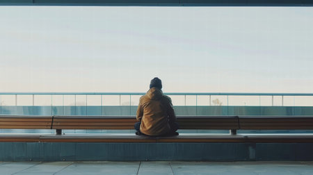 A lonely woman sitting alone on the bench, lost in thought on foggy day