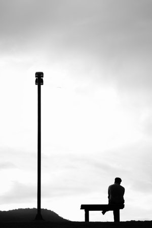A man sitting on the bench over the green grass field against the sky. Feel empty but peaceful. Black&White tone