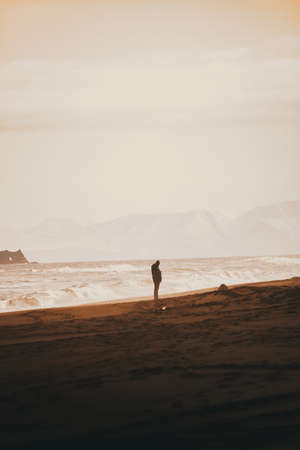 A person standing on a beach next to the ocean, A lone figure silhouetted against a black horizon