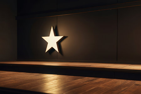 A golden geometric star stands on a surface, reflecting warm lights in a festive atmosphere.