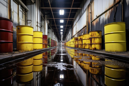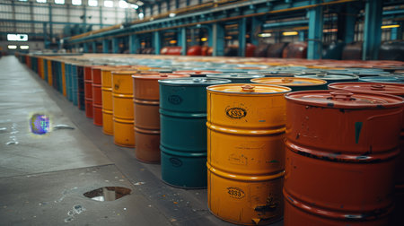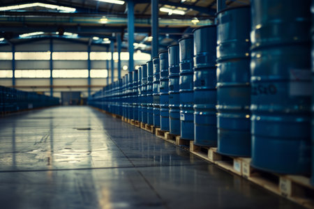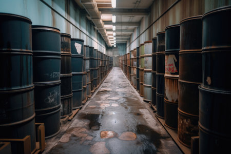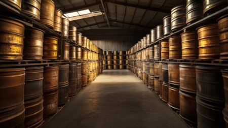 oil barrels lined up in a warehouse, created with generative ai
