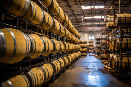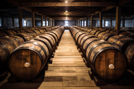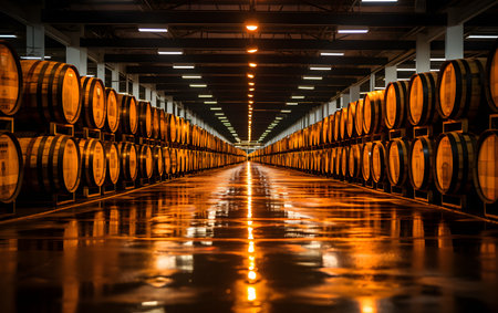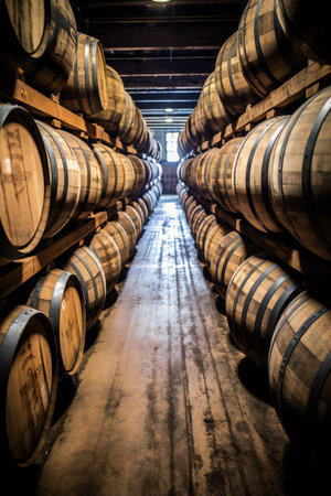 Whiskey, bourbon, and scotch barrels aging in a rustic facility, creating rich flavors and aromas