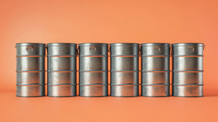A series of five metallic containers neatly arranged in a row against a vibrant orange backdrop. Ideal for various commercial or industrial applications.