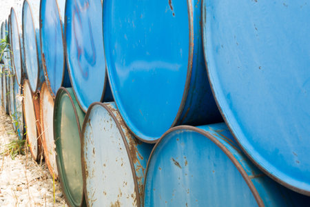 A close-up of petroleum oil barrels stacked, with ample space above for copy